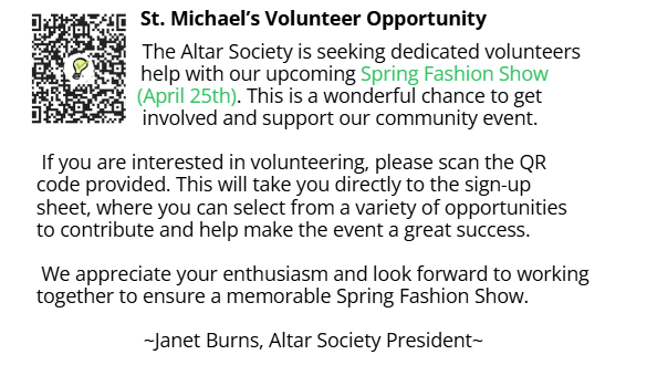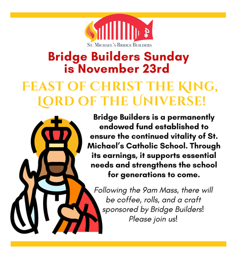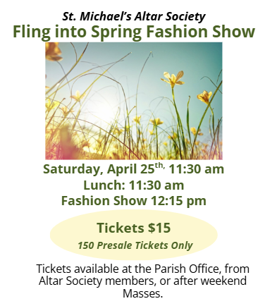 St. Michael’s Parish is a welcoming community of Catholic Christians, rich in tradition. We are inspired by the Holy Spirit and guided by the Word of God.